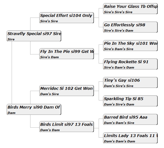 The most notable is RC Back In Black that Jane Melby qualified for the CFR and NFR on. She won 3 rounds at the 2011 NFR. Her back up horse RC Brooks A Streakin, which she rode at the CFR and NFR that year was also by Ninety Nine Goldmine. He won money in the rounds at the CFR. Katies Mine holds the arena record in Ponoka with a 17.0 on a standard pattern, KRK Goldmine and RC Packin Gold have both been CCA Finalists. Attached is a document listing many more notable offspring on the barrels. Ninety Nine Goldmine has also had several good colts on the track.