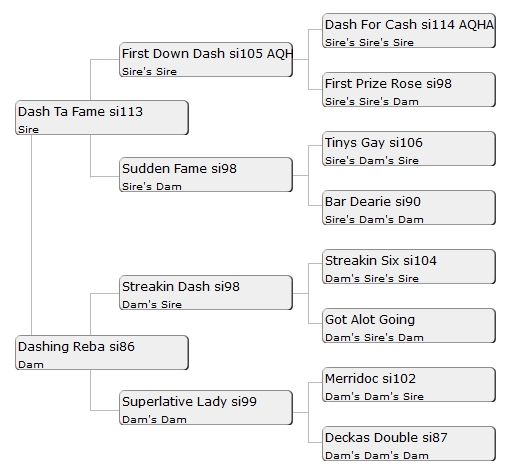 Flys Dash, aka Dash, is the product of our first breeding program. We raised her sire Pabs San Fly, by Gaydocs Pablito and out of money winning mare Rock San Star, by Gasahol. Dash is Unleashed Ta Flys dam.