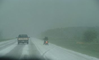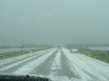 Here are some pictures of the hail storm my travelling partner Rhonda and I ran into just outside of St. Rose, MB last night. We let the poor bikers in the one picture hop in while their family came from town to pick them up. In the other picture you can see the water laying in the fields on both sides of the highway.