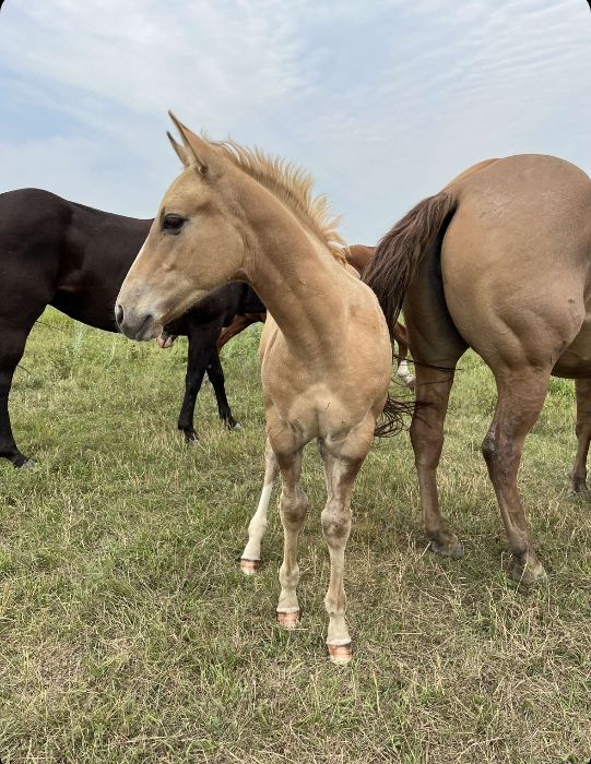 GB BADGES TUF GUY is a 2024 AQHA red dun stud colt, ropers & barrel racers take a look, this colt should mature to 15hh, stout and correct, great cross of run and cow!